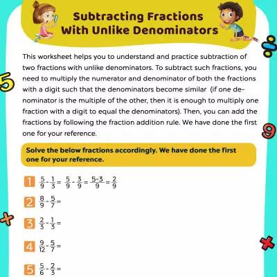 Fractions worksheets for grades 1-6 - K5 Learning Grade 5 addition and subtraction of fractions worksheets Adding like fractions (denominators 2-25) Adding mixed numbers and / or fractions (like denominators) Completing whole numbers Adding unlike fractions & mixed numbers Subtracting like fractions Subtracting fractions from whole numbers and mixed numbers (same denominators)
